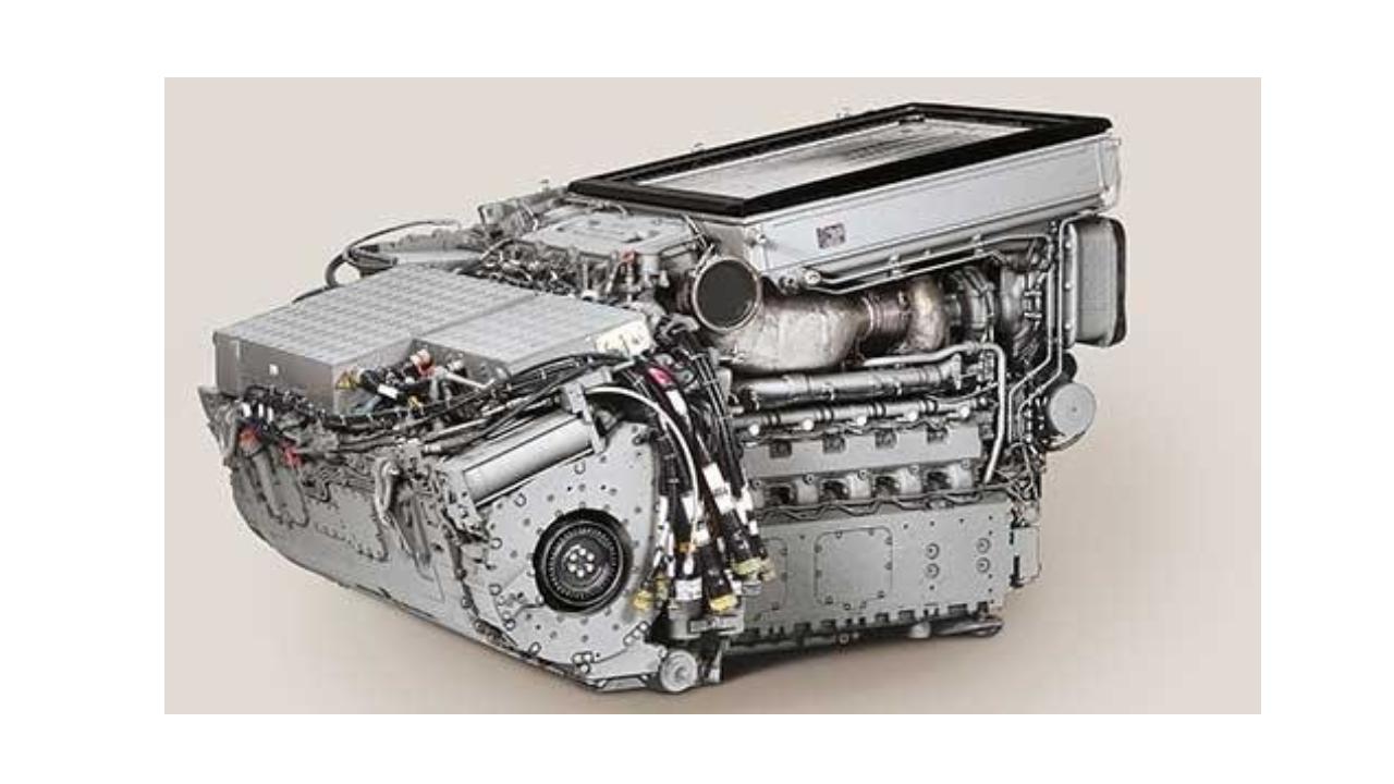 Compact diesel V10 producing around 920kW. Paired with Renk HSWL 256 gearbox, gear ratios, torque/power figures and o...